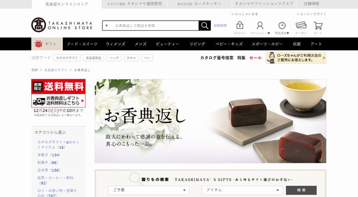 高島屋の公式通販サイトでは、弔事返礼・お香典返し向けコーナーが設置されています。予算とジャンルからの選択が可能となっています。
