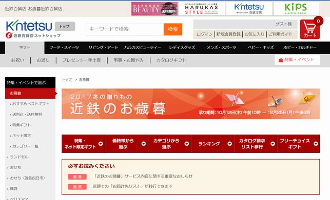 近鉄百貨店のオンラインストアでは、例年、お歳暮コーナーが展開されています。