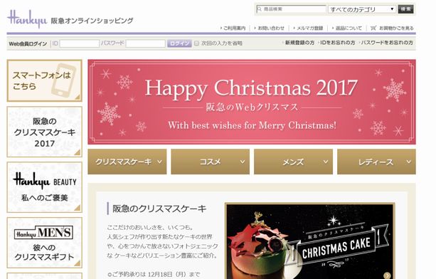 阪急百貨店の公式通販サイトでは、例年、クリスマス前に、クリスマスケーキやファッション、コスメなどのギフト好適品などが揃えられたクリスマスコーナーが設置されます。