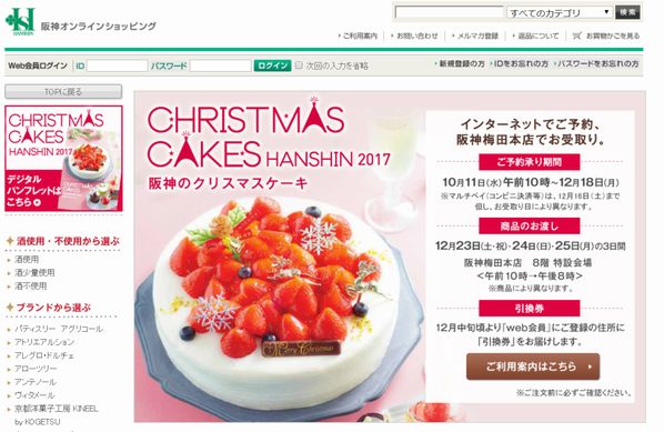2017年の阪神百貨店公式サイトのクリスマスコーナーは、インタネットで予約し、阪神梅田本店の店頭で受け渡しする形式となっています。