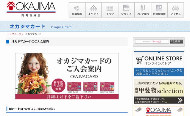 各デパートの「クレジットカード」「ポイントカード」「友の会」「株主優待」ご紹介 岡島百貨店 【岡島百貨店】でお得な「クレジットカード」「ポイントカード」「友の会」「株主優待」ご案内 こちらでは、山梨にあるデパート、岡島百貨店で便利な「クレジットカード」「ポイントカード」「友の会」「株主優待」をご案内しています。 クレジットカード「オカジマ...