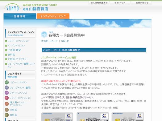 各デパートの「クレジットカード」「ポイントカード」「友の会」「株主優待」ご紹介 山陽百貨店 【山陽百貨店】でお得な「クレジットカード」「ポイントカード」「友の会」「株主優待」ご案内 こちらでは、姫路にあるデパート、山陽百貨店で便利な「クレジットカード」「ポイントカード」「友の会」「株主優待」をご案内しています。 クレジットカード「パスポー...